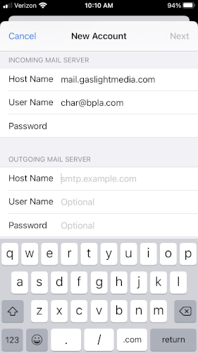 - Incoming and Outgoing mail server: mail.gaslightmedia.com